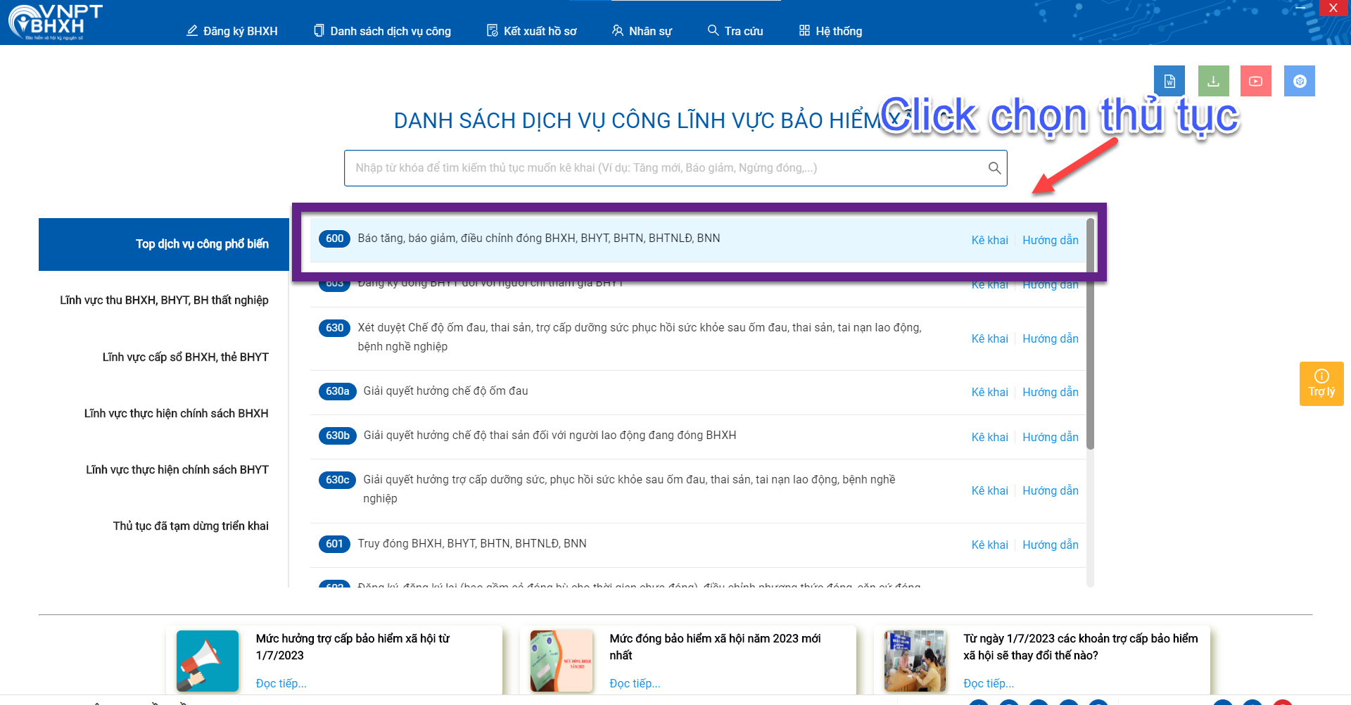 Bước 2: Chọn thủ tục kê khai